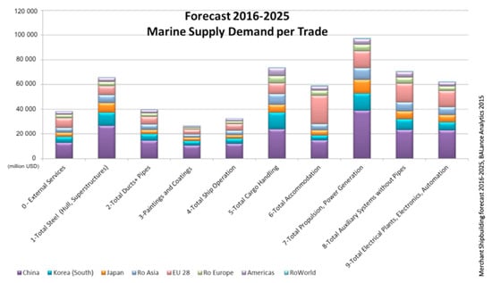 The marine industry is a specific area that generates huge demand for products and services from many other industries, such as carpentry; metallurgy; machinery and electromechanical industries; industrial automation; heating, ventilation air conditioning (HVAC); energy recovery systems; exhaust after treatment systems; corrosion protection systems; fire protection systems and petrochemicals. The supply demand forecast for years 2016–2025 is presented on the