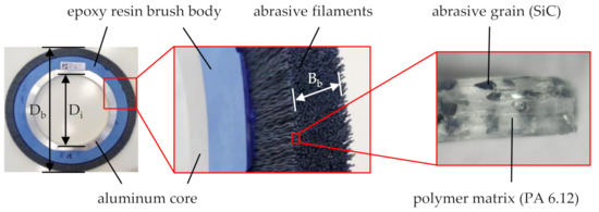 Among the potentials of brushing with bonded abrasives are low process forces and temperatures as well as the utilization of existing machine systems, such as industrial robots, grinding machines, or mills [1,7]. Furthermore, the high flexibility of the abrasive filaments causes them to deflect during contact with a workpiece, thus assuming its shape and compensating minor inaccuracies regarding the geometry of workpiece, tool, and path [10]. Tool wear leads to a slow but successive shortening of the abrasive filaments [8,11,12], until the filaments become too short and therefore too stiff in order to yield consistent processing results. In addition, brushing tools typically require an initial conditioning process to achieve approximately equal filament lengths, which may be time- and cost-intensive, depending on the characteristics of the brushing tool and the requirements of the brushing process.