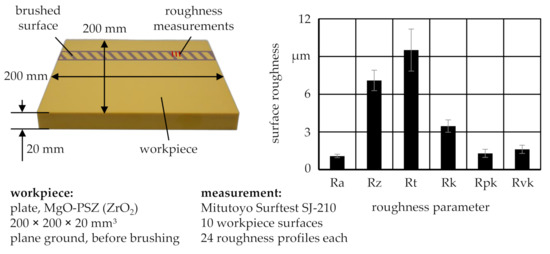 To gain a basic understanding of the mechanisms being effective while processing ceramic surfaces with abrasive brushing tools, experiments were conducted on rectangular ZrO2 workpieces of the type Frialit FZM, manufactured and ground to dimensions of 200 × 200 × 20 mm3 by FRIATEC AG, Mannheim, Germany. The sintered ZrO2 matrix was partially stabilized (PSZ) with magnesium oxide (MgO) to strengthen the material by retaining cubic fluorite crystal structures—usually only present at temperatures T of >2300 °C—and thus prevented monoclinic crystal formation, which would lessen the fracture toughness [4]. Through a conventional plane grinding process, the surface roughness was then reduced to an arithmetic mean deviation of the roughness profile of Ra = 1.1 µm (Figure 2), with all roughness measurements taken orthogonally to the grinding direction.