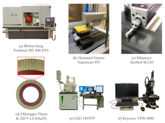 Before and after individual brushing cycles, the workpiece profile depth h was measured orthogonally to the brushing direction with a laser triangulator of the type optoNCDT ILD2300-2 by the manufacturer Micro-Epsilon Messtechnik Gmbh & Co. KG, Ortenburg, Germany. The sensor had a measurement range of 2 mm and was operated at a measurement frequency of fm = 1.5 kHz and a measurement feed velocity of vm = 100 mm/min occurring orthogonally to the brushing direction. The vertical resolution of the sensor was denoted by the manufacturer as 0.03 µm at a reference measurement frequency of fm = 20 kHz and should analogously be smaller for lower measurement frequencies fm. The manual fitting and subtraction of the pre-brushing profile h0 from the post-brushing profile h1 provided information on the material removal depth hr. The workpiece surface roughness was determined with a tactile instrument of the type Surftest SJ-210, manufactured by Mitutoyo Corporation, Sakado, Japan (Figure 3c). Furthermore, the workpiece topography was measured with a tactile surface measurement device of the type Nanoscan 855, manufactured by Hommel-Etamic GmbH, Villingen-Schwenningen, Germany (Figure 3b). Additionally, light microscopies were made with a microscope of the type VHX 5000, manufactured by Keyence Deutschland Gmbh, Neu-Isenburg, Germany (Figure 3f). The images were taken with a 500× magnification, with a high dynamic range (HDR) enabled, and in 3D mode in order to increase the depth of focus. Scanning electron microscopy (SEM) images were obtained with a microscope of type LEO 1455VP, manufactured by Carl Zeiss AG, Oberkochen, Germany (Figure 3e). For the evaluation of the material removal depth hr and the workpiece topography, the software MATLAB R2019b by The Mathworks INC., Natick, MA, USA was used.