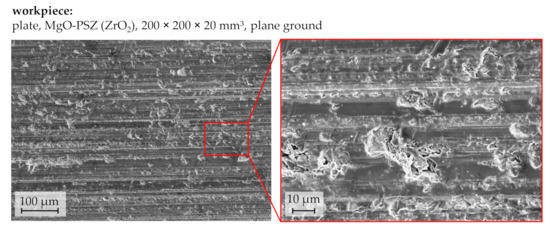 Characterizing the surface of the ground workpieces on the basis of SEM images (Figure 4), two prominent features became apparent: Firstly, the unidirectional grooves of the preceding plane grinding process stood out, discernable as parallel lines from left to right, and the breadth and occurrence of which depends predominantly on grain size and grain distribution in the grinding tool. Secondly, the plane ground surface was scarred with unevenly spread pockmarks of various sizes and shapes. Their approximate depths could not be determined based on SEM images but are suspected to be larger than those of the unidirectional grinding grooves. Equally unclear is whether the pockmarks were caused solely by the plane grinding process or originated from the workpiece composition and sintering. The comparison with workpieces from the same batch, which were lapped instead of plane ground, showed similar pockmarks and therefore suggests that they might be induced prior to the grinding process and then exposed by it, likely due to inhomogeneous crystal formation.