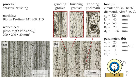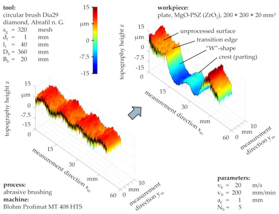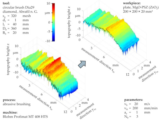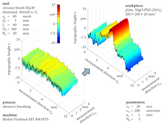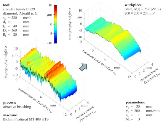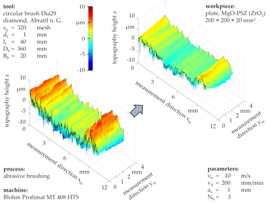 Considering the topographies before and after brushing with a grain size of sg = 320 mesh and standard process parameters (Figure 7), a preservation of the workpiece waviness can be observed alongside with an alteration of the surface roughness, characterized by the retaining of roughness valleys and the removal of roughness peaks. This suggested that successive abrasive brushing with fine grains subjected to a force-controlled principle allowed for the surface finishing of ZrO2 without the formation of entirely new surfaces, as would be the case for similar finishing processes such as fine grinding or lapping, subjected to position-controlled principles.