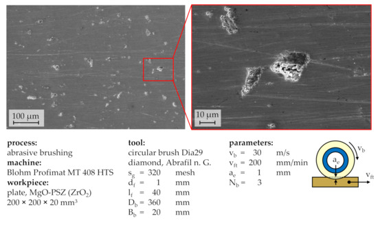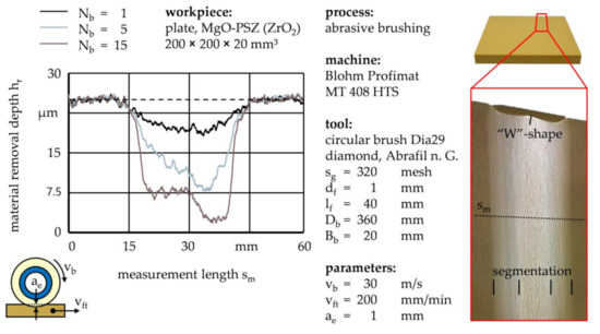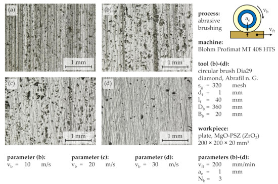 In addition, the technological investigations conducted for this work confirmed an independence of the processing result from the feed velocity vft, meaning that multiple brushing cycles Nb at high feed velocities vft amounted to similar results to few brushing cycles Nb at low feed velocities vft, as long as the overall contact duration between tool and workpiece remained the same. Nonetheless, the low heat conductivity of ZrO2 might make brushing at high feed velocities vft more feasible and reduce tool wear due to a better distributed heat flow and more cooling time between brushing cycles, which prevents the plastic matrix of the abrasive filaments from melting and leaving residue on the workpiece, avoiding additional cleaning processes.