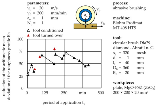 Apart from the aforementioned profile deviation, brushing tools are prone to lose sharpness over time due to an adjustment of the initially cylindrical abrasive filament tips to the workpiece surface, gradually transforming a sharp point contact into a flat, elliptical contact geometry [11]. Although the interrelations between wear and machining characteristics were not yet scientifically understood, first conclusions can be indirectly drawn from the processing result. One such correlation was the percental reduction of the workpiece roughness, specified by the arithmetic mean deviation of the roughness profile Ra, measured over the entire period of application tu of the brushing tool (Figure 15).