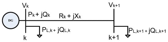 The major concern of this study is the optimal integration of distributed energy resources (DER) and NR in microgrids to optimize energy losses and reduce voltage drops. A PSO algorithm is proposed to solve the multi-objective optimization problem. The distribution network is usually radial, and the ratio of R/X is extremely high in comparison to that for a transmission system. The Newton–Raphson load flow method is suitable for resolving the load–flow problems of the distribution system. The main objective of the load flow is to calculate the bus voltage, line current, and PQ losses at each bus. Our proposed methods managed DG sizing and placement to improve voltage profile and loss minimization in base and reconfigured distribution system. Considering the penalty factor to find more accurate and actual results of the voltage profile and power loss. For example, one can assume a line section between k and k + 1 with an impedance of Rk + jXk and loads at bus k and k + 1, as shown in Figure 1. Pk and Qk are the real and reactive power flows from bus k to k + 1, respectively, and Vk and Vk + 1 are the complex voltages. The power loss in the feeder section between buses k and k + 1 can be computed as follows [40]: