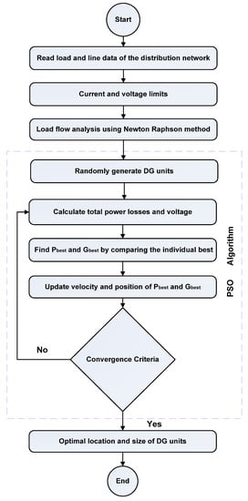 The particle locations initialized at random are based on the limits of the basic control parameters. In [52], the optimum six parameters of the PSO (, , , , N, and ) are shown to be highly effective in the system during convergence. Therefore, we need to select apposite values to achieve better efficiency. In this study, the values of self and social accelerating coefficients and are taken as 2. The weights and for the particle velocities are taken as 0.4 and 0.9, respectively. The maximum number of iterations 100, with 100 number of particles (N) are used for PSO. PSO convergence criteria are iter = , or . PSO is implemented on IEEE-33 bus system in base and after NR to analyze their effects on minimizing power losses and voltage profile improvement. The flow chart of the PSO algorithm is shown in Figure 4. In the minimization problem, is the personal best position in the search space, which will lead to the smallest error and can be calculated using (19). Likewise, the global best position is the best particle in the search space among all of the particles in the group by using (20). The particle that provides accurate personal best results will show the minimum error.