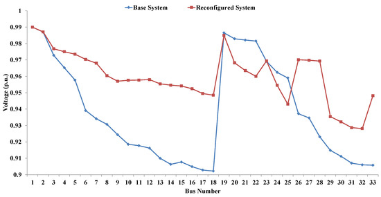 Voltage profile of base and reconfigured distribution system.