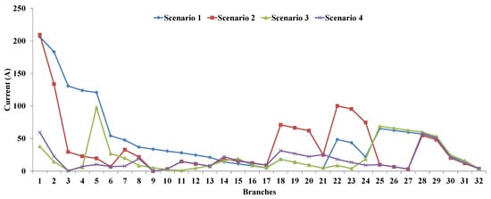 The current capacity limits of all branches are considered as 200 A, except for branches 1–9, which have a capacity of 400 A. Every branch should have a current flow below the thermal permissible limits, as follows: