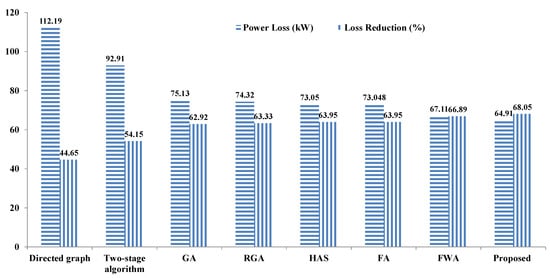 The performance of the proposed work is compared with that from the available literature in the form of active power loss, i.e., the HSA (73.05 kW) [40], GA (75.13 kW) [40], RGA (74.32 kW) [40], FA (73.048 kW) [44], 2-stage algorithm (92.91 kW) [54], FWA (67.11 kW) [55], and direct graph (112.19 kW) [56]. Our proposed method provides 64.91 kW. Thus, our proposed method shows better results than those of previous research in terms of minimizing power loss and enhancing voltage stability, as shown in Table 3 and Figure 10.