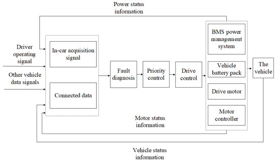 The driving strategy and the fault handling strategy were formulated based on the different working conditions of the vehicle and the actions of the driver, respectively, and the priority according to the different vehicle working conditions was set to ensure the normal operation of the vehicle under the established control strategy. The overall framework for the control strategy of the intelligent networked vehicle controller is shown in Figure 1.