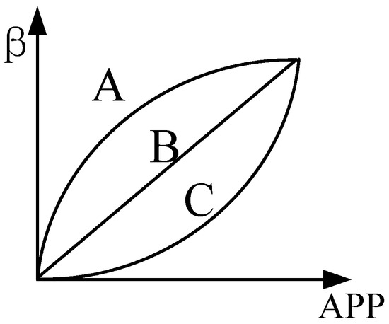 During the driving process of the vehicle, the accelerator pedal opening degree reflects the driver’s required torque to a certain extent. At the same time, the specific value of the output torque is jointly determined according to the internal motor speed of the vehicle. These quantities can be established as a mapping function, as shown in Figure 2, which defines the corresponding relationship between the load torque coefficient β and the vehicle accelerator pedal opening (APP) in the motor system.
