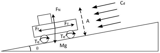 During the vehicle’s driving process, the motor system generates torque output, which is transmitted to the wheels through the transmission device, and the wheels realize the driving function under the conditions of overcoming friction and gradient resistance. The entire driving motion model can be simplified as shown in Figure 4, where FN is the supporting force of the ground on the vehicle, Ff is the friction force downward along the slope, and FT is the driving force of the vehicle angle forward.