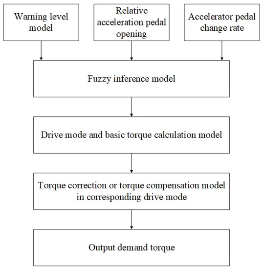 In the paper, a representative one-way front and rear following vehicle scene was selected for research, and a drive control strategy combined with intelligent and connected technology is proposed. An early warning model was established to classify the risk related to the distance between the front and rear vehicles, and the pedal drive mode was selected together with the driver’s driving intention. For different driving modes, the torque correction model, optimized torque correction model and torque compensation model under the safe distance were established respectively, so as to realize the combination of in-vehicle drive control and real-time vehicle condition information, and intelligently adjust the output torque. The process of the drive control strategy is shown in Figure 5.