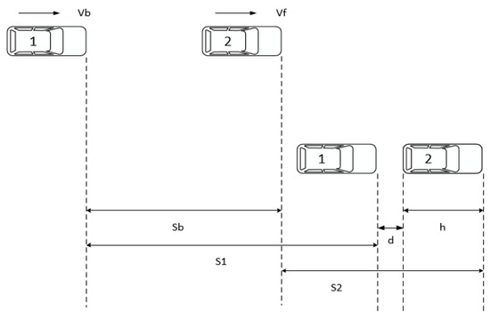 The one-way front and rear following vehicle scene is shown in Figure 6. In a lane in the same driving direction, the length of the vehicle body is h, the speed of the designated vehicle is Vb, and the speed of the preceding vehicle is Vf. Under the premise that the speed of the designated vehicle is greater than the speed of the preceding vehicle, that is, Vb > Vf, when the headway is equal to 5 s, the distance threshold Sa at this time is calculated. When the following vehicle finds that a collision is about to occur, the distance between the two vehicles is Sb, and then the following vehicle starts to react and starts to brake. After the reaction time Tr has elapsed, the driver of the following vehicle brakes, the following vehicle receives a response after the elapse of time Ti, and performs a uniform linear deceleration motion at the maximum deceleration a. After the front and rear vehicles have traveled the distances of S1 and S2 respectively, the speeds of the front and rear vehicles remain the same. At this time, the speeds of the front and rear vehicles are both Vf, and the two vehicles maintain a safe distance d. The warning level threshold is: