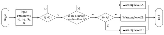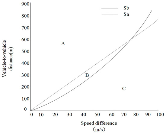 As shown in Figure 7, the front-to-rear vehicle time distance equal to 5 s (the critical point of the vehicle following state [24]) and the safe distance model distance were used as two thresholds, which were divided into three segments in order to set the early warning level. As shown in Figure 8, when the distance between two vehicles was greater than Sa, early warning level was classified as A (safe mode). When the distance between two vehicles was between Sa and Sb, it was classified as early warning level B (following mode), and when the distance between the two vehicles was less than Sb, it was classified as early warning level C (dangerous mode).
