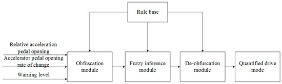 Using the accelerator pedal opening APP, the accelerator pedal opening change rate dAPP and the warning level as input parameters, the accelerator pedal opening and its change rate were fuzzified according to the membership function using the fuzzy inference method, after which the inference was performed according to the fuzzy rules to complete the choice of drive mode. The drive mode selection process is shown in Figure 9.