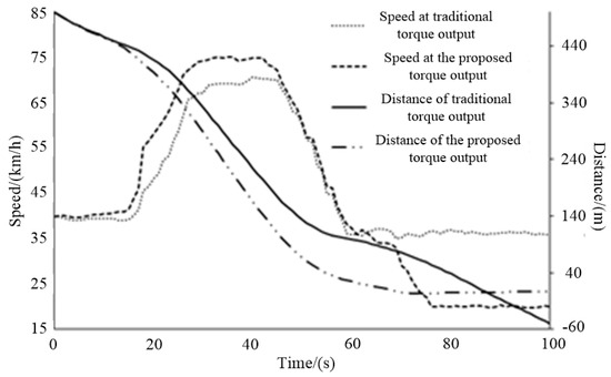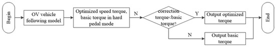 As shown in Figure 11, the optimized torque calculated based on the optimized speed and optimized acceleration under the OV car-following model is used to correct the basic torque. When the basic torque is within the optimized torque range, the vehicle still outputs the basic torque. When the basic torque is greater than the optimized torque, the vehicle uses the optimized torque as output, so that the vehicle is in an optimized acceleration and speed state.