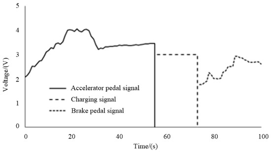 The definition of priority mainly included the classification of charging conditions, driving conditions and braking conditions. When the vehicle was connected for charging, the vehicle controller communicated with the on-board battery pack to obtain charging information through the CAN bus. At this time, the vehicle was considered to be in charging mode. When the vehicle controller obtained the driver’s operation signal, the vehicle was considered to be in driving mode. When the brake pedal signal was detected, the vehicle was considered to be in braking mode. Of these three working conditions, the brake working condition had the highest, the charging working condition the second, and the driving working condition the lowest priority. When the vehicle entered the starting state, defined as the vehicle controller detecting the accelerator pedal signal and the charging signal at the same time, the accelerator pedal signal was forcibly set to zero, that is, the charging prohibition driving mode. When both the accelerator pedal signal and the brake pedal signal were detected at the same time, the accelerator pedal was forced to zero, that is, the brake priority processing method.