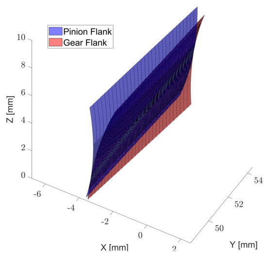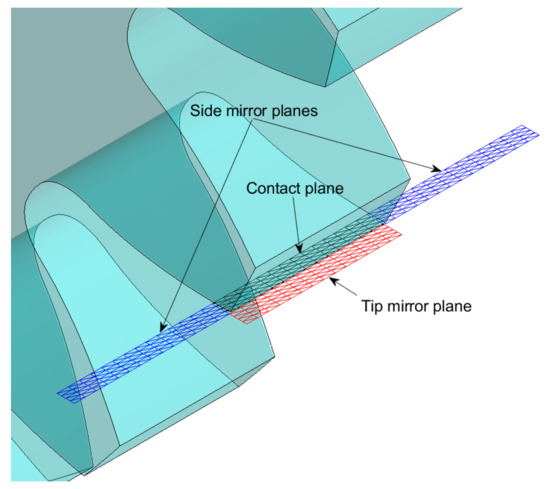 Evidently also gears have finite face-width and, therefore, the mirroring operation is carried out as described earlier its effect is visible in Figure 9. The data of the tested gears are listed in Table 3 and it is clear that if no mirroring is applied two important pressure peaks are present at the free edges of the contacting flanks, which disappear as expected when the proper measures are taken. However, if one of the two bodies has a face-width greater than the other those peaks correctly reappear, although with lower values. Furthermore, gears have another free side at the tip of the tooth which must be taken into account. For this reason, a tip mirror plane is accounted for when part of the contact plane of one of the two gears lies outside of the flank and in this case the tip edge is taken as the mirror line, as visible in Figure 10.