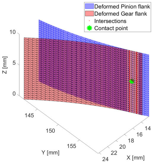 Surface intersection between two engaging teeth and location of the contact point at equilibrium after deformation.