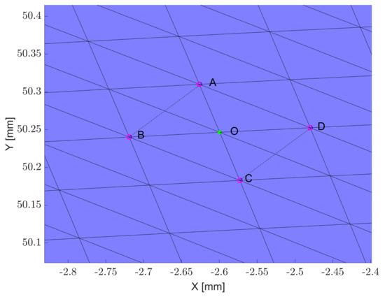 In this work, the location of the contact point is not defined kinematically by finding the location of the intersection of the line of action (LOA) with the tooth profile at different angular positions, but it is instead sought for by a surface to surface intersection method on the rigid profiles for the first iteration, while on the deformed ones for the successive iterations of the iterative algorithm that will be described later. The surfaces of the teeth are triangulated as visible in Figure 2 and then rotated of a small angle (usually rad) towards each other around their center of rotation and resulting intersection points are found through the application of the Möller–Trumbore ray-triangle intersection algorithm in which each triangle edge of each surface is treated as an infinitely long ray and an intersection is sought with the triangular faces of the opposite surface as visible in Figure 3 (for more details on that methodology, please refer to [44,46,47]). If an intersection is found between the ray and the surface of one of the triangles a check on the actual intersection is made by verifying if the location of the intersection point lies between the endpoints of the considered edge by