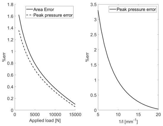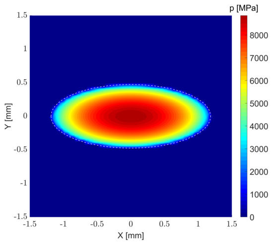 where . To solve the problem stated in Equation (15) and satisfy all the conditions a two nested sub-iterative processes are needed, as detailed in [50,58] to remove the residual traction stresses and to obtain the correct total transmitted force based on the computed force at the iteration and the value at the previous one . The first one is used to identify the correct contact footprint devoid of tension forces given a certain initial indentation , while the second is used to estimate the correct indentation to impose to the profiles so that the resulting transmitted force is within tolerance of the applied load. To validate the proposed approach and ellipsoid to ellipsoid contact is compared to the results from Hertz theory [52]. The two contacting ellipsoids ( GPa, ) have major radii mm and mm and minor radii mm and mm, respectively, pressed together by a normal load F = 10,500 N on a mm contact plane with equilateral triangles with a side length mm. The obtained pressure distribution is visible in Figure 6 in which the white line represents the predicted contact area from Hertz’s theory. The visual comparison shows a very good agreement and a numerical comparison is shown in Figure 7 where the obtained values for a varying load between 1000 ÷ 15,000 N show an error for both the maximum pressure and the contact area always lower than . The influence of the mesh size is also visible in the same figure for the maximum load and shows a trend quickly approaching lower errors as the length of the triangles sides decreases.