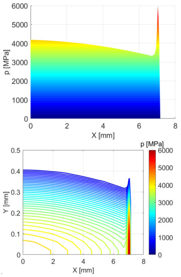 If the two bodies in contact have different finite length the mirroring operation is carried out accordingly at the free edges of each body. In order to verify the non-Hertzian results and the efficiency of the mirroring correction a model of a crowned roller bearing contacting with a cylindrical inner race has been compared with the results from [61] and the geometrical and material data are reported in Table 2. A mesh of right triangles with equal sides of mm was defined and the resulting non-Hertzian pressure distribution obtained by the application of the current method can be seen in Figure 8 for a load F = 33,800 N where a distinct pressure peak can be distinguished at the edge of the crowned roller, while the central part has a trend similar to the ellipsoid to ellipsoid contact seen in Figure 6. The obtained results agree extremely well with the numerical and FE values detailed in [61], although minor differences are present due to the different discretization of the contact plane.