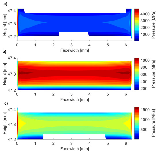 Effect of plane mirroring on the pressure distribution for meshing gears. (a) No mirroring, (b) Mirroring, (c) Mirroring, .
