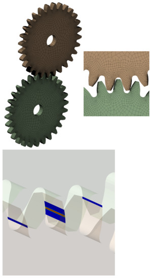 - Hu, W.; Chen, Z. A multi-mesh mpm for simulating the meshing process of spur gears. Comput. Struct. 2003, 81, 1991–2002. [Google Scholar] [CrossRef]