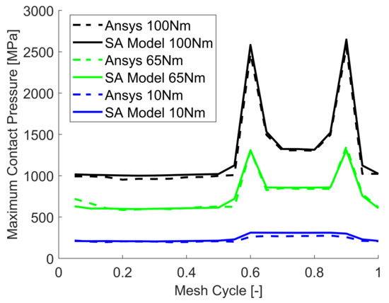 where the rotations of the engaged pair of the pinion (p) and driven gear (g) are measured at the point of maximum displacement inside the contact area. Since the analyses in the present paper will deal with quasi-static conditions no dynamic effect is included. Additionally, no manufacturing, mounting, or other possible errors are considered at this point, hence the STE is equal to the global transmission error (TE). Results from the proposed SA approach are firstly compared against a 3D FE model from Ansys which adopts quadratic 20-node solid elements (SOLID186) and a very refined mesh ( mm for a total of 441,562 nodes, 394,002 elements and 1,311,456 degrees of freedom) for the contacting flanks which are modeled as pairs of frictionless contact-target elements (CONTA174-TARGE170) in surface-to-surface contact using the augmented Lagrangian algorithm. The hub of the pinion gear is grounded through rigid body elements to a central node which is only free to rotate around its axis and where the torque is applied and the displacement recorded. Similarly, the hub of driven gear is constrained against all possible motion. The FE mesh and an example of the obtained contact pressures are visible in Figure 11, while the relevant data are listed in Table 3. A sequence of 20 nonlinear static analyses with automatic substepping is performed at different rotation angles to cover the whole mesh cycle which corresponds to , as done in [63,64]. Since the transmission ratio of the studied gears is equal to one, between each analysis the FE mesh of the gears is rigidly rotated of the same angle according to their rotation directions, hence the motion is not caused by the applied torque but imposed by the angular displacement of the contacting gears. A comparison of the different approaches is visible in Figure 12 for three different torque levels. The overall agreement of the results is evident, while a small difference in the double contact zone is visible which amounts to a maximum of at the highest load. The agreement is extremely good also in terms of maximum contact pressure, as visible in Figure 13, for both the single and double contact regions, as well as the pressure peaks occurring when tip-corner contact is present. However, it must be noted the the calculation in Ansys on a laptop equipped with an Intel Core i7-7700HQ CPU and 32Gb ram takes around 4 h with a so refined mesh at the surface of the engaging teeth, whereas the proposed SA approach employs only 3 min on the same machine, yielding a significant time saving without even considering the time spent to properly generate the FE model.