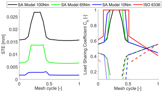 Due to their inherent nature, load and stiffness fluctuations are the main source of excitation and cause of failure in geared transmissions [1,2,3]. Early experimental works from the Japanese school highlighted the interesting dynamic features of those systems, analyzing their torsional behavior including other sources such as profile errors or modifications [4,5,6,7,8]. At first, the dynamic factor (DF) was used to characterize and explain certain types of failures [9] by comparing the dynamic loads in operation with those under static conditions. Vibrations and impacts can certainly be traced back to variations in the input torque depending on the machine characteristics [10,11,12], but the time-varying mesh stiffness (TVMS) was quickly found to be a key player [13]. Indeed, the stiffness of an engaging gear pair changes continuously due its nature and can generate self-excited vibrations which led many researches in the study of the transmission error (TE). Over the years several methods have been proposed, starting from integral approaches [14,15] or discrete ones [16,17]. Others considered the tooth as a trapezoidal beam [18] while also semi empirical formulas have been proposed [19,20]. Experimental methods were also proposed to study the static transmission error (STE) [21,22,23], while others included mounting and manufacturing deviations to estimate the manufacturing transmission error (MTE) [24,25,26,27]. Finite element (FE) models were obviously proposed as well, but its time-consuming nature and difficulty to set up made it applicable to limited aspects, such as tooth root stresses and its structural behavior [28,29,30], crack propagation [31,32,33,34,35], or generally as a validation tool for other proposed models. Hertzian theory [36] of cylinder-to-cylinder contact is generally employed to model the contact between engaging flanks, simplifying several key aspects of the gears, such as the continuously varying curvature and the presence of sharp edges. When contact is not neglected it is generally introduced as an addition to the elastic behavior of the mating teeth, but still under Hertz’s hypotheses [37,38,39,40,41], while other works included non-Hertzian properties, but neglected the flexibility under load of the teeth [42]. Hybrid approaches coupling a FE model with a semi analytical (SA) contact model have also been proposed [43] with great success.