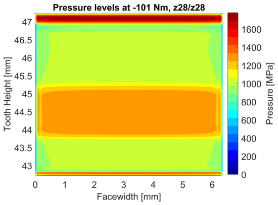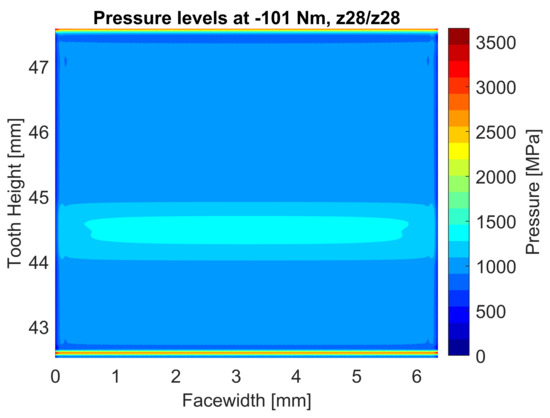 The STE and load sharing coefficients of the same gear pair under a load of 100 Nm are visible in Figure 14. In the same figure, it is possible to appreciate the dependency of the load sharing factor and contact ratio with respect to the torque level. In particular, it is evident that the increase in the contact ratio as the torque increases which is not considered by the standards. The actual contact ratio, which can be extracted by the load sharing characteristics, ranges from the value computed according to literature [65] 1.638 to the highest 1.85 due to the maximum torque, that corresponds to an increase of about 13%. A detailed pressure map of the flank at the highest torque displaying the pressure peaks due to tip contact is shown in Figure 15. Under these conditions the maximum pressure reaches 2648 MPa which could cause surface damage since it is higher than the design value in the single contact zone (1336 MPa).