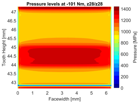 Flank pressure distribution of the tested gear pair without modifications.