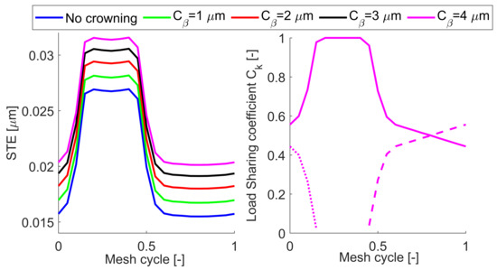 Effect of parabolic tip relief length of modification on the STE and load sharing in combination with face-width crowning , and ( mm and m).