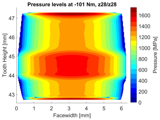 Flank pressure distribution of the tested gear pair with parabolic tip relief, mm and m and m, and parabolic crowning.