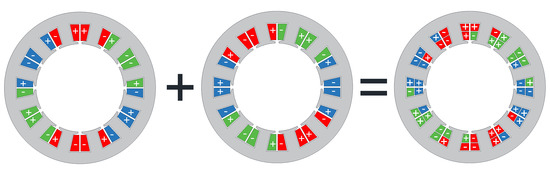 Four-layer winding is obtained when two identical sets of double-layer windings are used and the sets shift by ys slots (mostly by one slot to avoid high fundamental space harmonics reduction). Current polarity in the shifted winding set has to be changed to not to get the opposite direction of currents inside one slot if the shift ys is an odd number. The principle of the four-layer winding definition is shown in Figure 1.