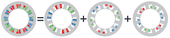 Every slot consists of three coil sides belonging to one phase and one coil side belonging to the other winding. This slot arrangement can be divided into three single-layer winding, as shown in Figure 2.
