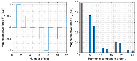 This effect is represented by the produced step curve of magnetomotive force Fm and its spectral analysis in Figure 3. The fundamental harmonic component is ν = 1 for integral slot winding and ν = 5 for fractional slot winding.