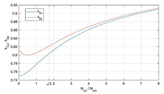 The analytical integral solution of magnetic energy stored in the slot is evaluated for all combinations in Figure 5. The total magnetic energy produced by analyzed winding is compared with theoretical full-slot winding and the dependency of coefficients kCu and kke for different Ncc/Ncm ratios is shown in Figure 6.