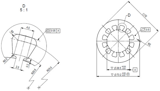 A small stator stack with the dimensions shown in Figure 7 is used for the physical model of PMSM with the designed three-layer winding. The stack is made of M800-50A electrical steel with the Suralac 5012 insulation and the stack length is lFe = 40 mm.