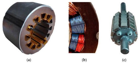The lining of the slots is achieved by the Kapton tape (Figure 8a) and the inter-turn insulation is ensured only by the double-layer wire insulation. The color emphasis of different phases is shown in Figure 8b The rotor yoke is created by the construction steel sheets and the surface-mounted permanent magnets are glued to the yoke, see Figure 8c.