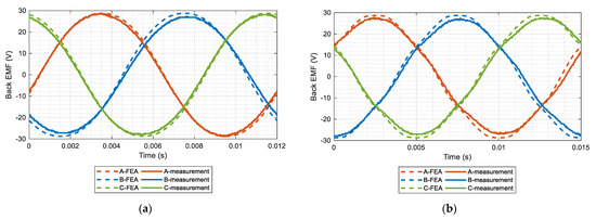 The machine was built and measured under the no-load and short circuit operation to measure the equivalent circuit parameters. Comparison of the measurement of the back EMF with the FEA results is shown in Figure 9a Reference machine with double-layer winding q = 1/2 was built in parallel and the reader can compare the back-EMF waveforms obtained by both windings in Figure 9. The harmonic content of the back EMF waveforms obtained by the FEA and measurement is almost identical for both windings. Even from the shape of the waveforms, it is evident that the modified three layer winding (a) generates a smaller amount of spatial higher harmonic components.