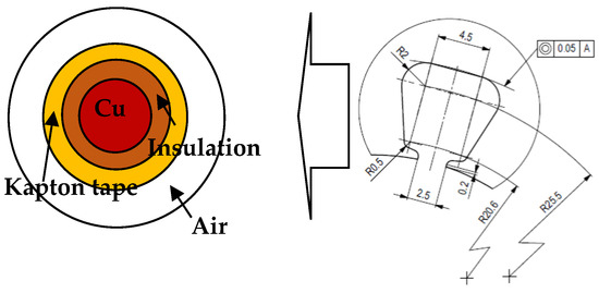 The homogenous model of the slot is created; the slot area is replaced by the concentric circles respecting the area of (copper and wire insulation of all conductors in the stator slot plus Kapton tape added in the slot) and the surrounding air [15,27] (see Figure 11). The number of conductors and their area of the cross-section is then represented by circles. All dimensions refer to the real topology; the cross-section is shown in Figure 7. Radius of the equivalent copper layer and width of the insulation and Kapton tape annular layers are defined by the sum of the real materials between the center of the slot and the slot wall; these values are constant in both tangential and radial directions.