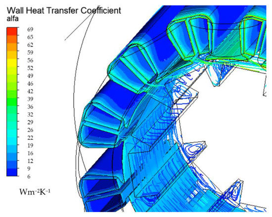 The tested speed of the machine is ns = 1000 rpm. The empirically calculated heat transfer coefficients are αst in = 44 Wm−2K−1 for the inner stator surface and αrot out = 24 Wm−2K−1 for the rotor outer surface. These coefficients are based on the formulas from literature [14,16,17]. These values are confirmed by the 3D computational fluid dynamics (CFD) simulation of the rotating machine (see Figure 14).