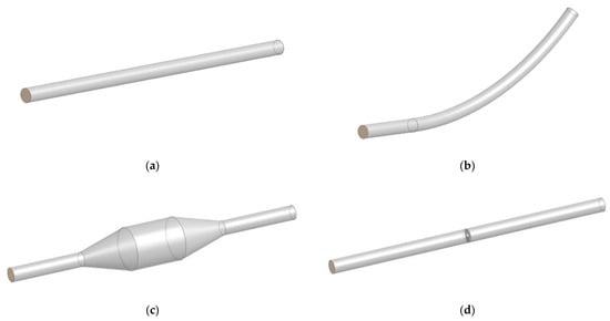 Four shapes of the subject of analysis: (a) straight pipe, same shape as the experiment; (b) bent pipe; (c) tapered pipe, shape of the expansion duct of SCR; and (d) an orifice installed in the center of the pipe.