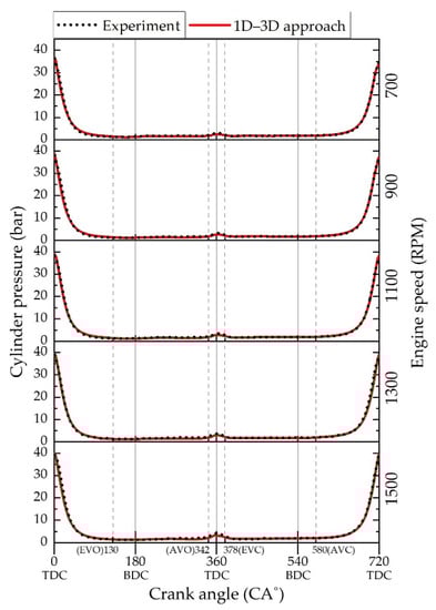 Cylinder pressure results of the experiment and the 1D–3D approach numerical analysis according to the engine speed.
