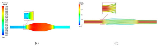 Flow characteristics results of the 1D–3D approach numerical analysis in the straight pipe shape exhaust system: (a) pressure contour; (b) velocity vector.