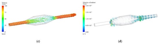 The pressure, streamline, and velocity results were analyzed, which can be used to study the flow characteristics of turbocharger matching and the emission control device applied to the exhaust system. The results were compared when the exhaust valve was fully opened, and the pressure results were expressed as contours so that they could be used to analyze the pressure waves. In the exhaust system of a diesel engine it is necessary to analyze the pressure wave, because the pressure wave caused by the outflow from the cylinder at the start of the exhaust process affects the system until the end of the exhaust process due to the inertia effect []. The shock wave can be analyzed using the streamline result, and it is also used in the study of supersonic flow [].