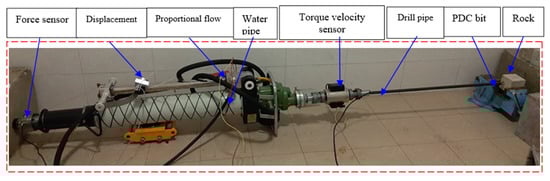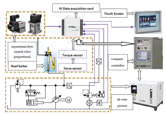 The experimental system is connected to high-pressure water, to scour the cuttings and cool down the PDC bit, in an effort to more realistically simulate the support situation of a roadway in a coal mine. This system is equipped with an SMC electric proportional flow valve and a valve-matching amplifier, allowing the computer to automatically control the size of the system’s valve opening, automatically control the size of the pneumatic motor’s rotation speed, achieve remote automatic control, and ensure convenient and safe operation. Due to the need for multi-channel data acquisition, the system also needs an electric proportional valve to control the signal output. Because of its simple structure, light weight, high precision, good reproducibility, and high responsivity, the USB6009 data acquisition card is used in this system for data acquisition and control. The LabVIEW software can also be used. The graphical programming language of this system has many controls that can be invoked. These controls are simple, fast, very reliable, and seamlessly connected with the USB 6009 data acquisition card. The specific hardware of the experimental system is shown in