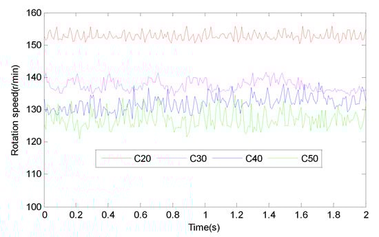 Figure 8 that, under the same pressure from the compressed air of the air compressor, when drilling four kinds of rocks with different strengths (C20, C30, C40, and C50) using an anchor drill, the force on the bit is almost the same, but the amplitude of the force on the bit, when drilling higher-strength rocks, is greater than that when drilling lower-strength rocks.